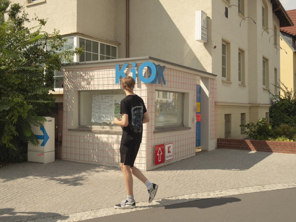 Die Design-Studierenden mit der Unterstützung der Professorin Brigitte Hartwig entwickeln daraufhin ein Konzept, wie dieses Eckgebäude genutzt werden kann. Nach gründlicher Reinigungsaktion und Träumen von Spätis und Weinbars, wird der Ort zum KiOSK. Die Fenster lassen sich nicht öffnen, aber die Gruppe von Studierenden lassen ein kleine, feine öffentliche Galerie entstehen, die dank der Interak-Tür auch mit der Nachbarschaft kommunizieren kann. Auf einmal lädt dieser unhandliche Ort am Kreisverkehr zum “Cornern” ein, das kleine Mäuerchen daneben reicht als Sitzfläche und kleine Events wie Vernissagen lassen Menschentrauben bilden.