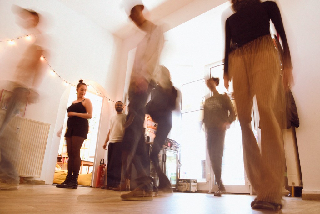 Die Formate, die im Mitte stattfinden, sind so unterschiedlich wie die Gemeinschaft, die sie nutzt. Neben den sogenannten „Caretakers“, die sich ehrenamtlich um Logistik, Kommunikation – wie zum Beispiel Social Media – und die Erhaltung des Raums kümmern, sind die Makers ein super wichtiger Teil des Mitte. Jede Person, die eine Idee für ein bereicherndes Format hat, kann diese in der Regel umsetzen. So zum Beispiel auch Ipek und Egehan, zwei türkische Studierende, die an der Hochschule Anhalt im internationalen Masterstudiengang Integriertes Design studieren. Auf den Vorschlag von Ege – der in seiner Heimat jahrelange Erfahrung als Salsa-Lehrer gesammelt hat – wird seit Herbst 2024 im Mitte dienstagabends getanzt.